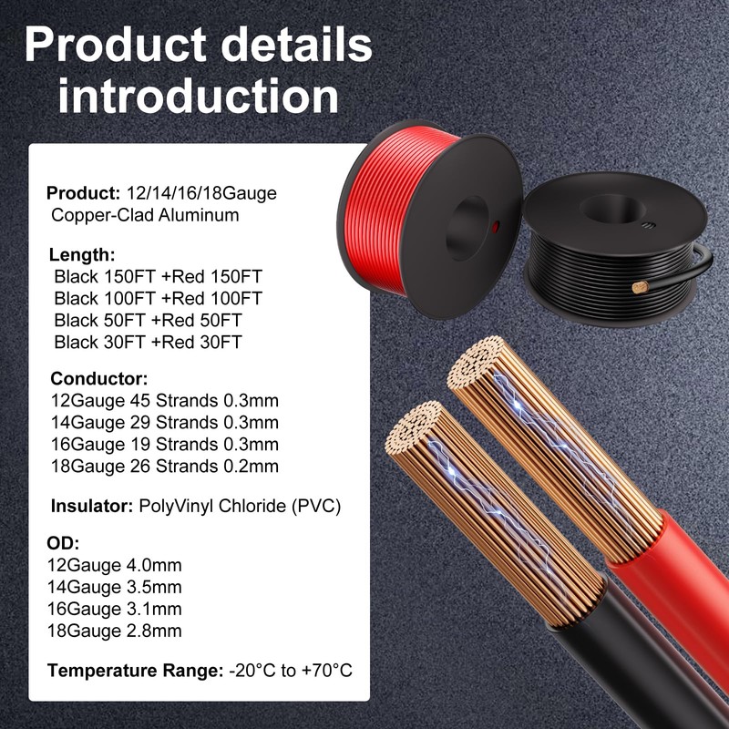 - SPECIFICATIONS: The wire has an overall diameter of 3.5mm/0.137 inches, and 29strands of 0.3 mm of copper-clad aluminum(CCA)constitute.are inside each circuit, has lower resistance and higher conductivity 14 Gauge Electrical Wire :2 colors, 100 ft red 14 AWG PVC wire*1, 100 ft black 14 AWG PVC wire*1, total 200 ft 14 gauge auto wire. 12V/24V DC Cable.