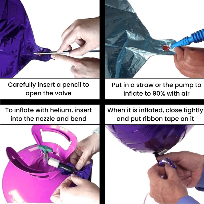 - Easy to Use The operation is very simple, they can be inflated with helium or air easily with a straw, thanks to the safety valve, it will last for days without losing air. Includes a decorative ribbon to tie the end of the balloons.