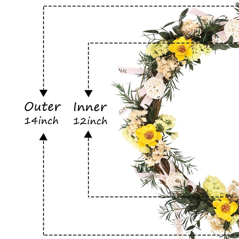 - PROPER SIZE: Fully expanded door wreath, the inner diameter is about 10 inches, outer diameter is about 14 inches. To prevent the wreath from being damaged during transportation, the wreath decoration is tightened, packaged in an exquisite and premium box so you don't have to spend extra time and money on packaging.