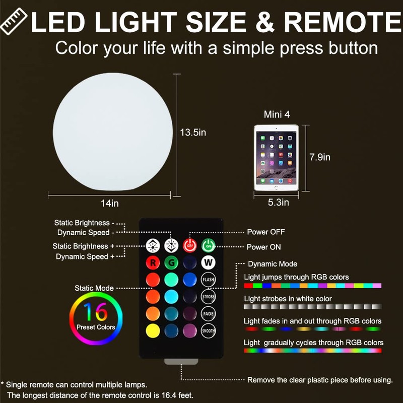 - 【Multi Purpose LED Globe Orb Lamp】RGB luminous ball, a decorative color-changing ambiance night light. Not only can decorate kids room, bedroom and living room, adding a charming decorative glow to your home. Also can decorate garden, path, lawn, pool, deck, wedding and bar, to create atmosphere, add character & bring fun, the perfect solution for boring places.