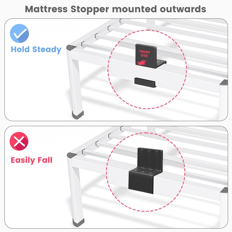 - Easy Installation: With upgraded folding slats and leg support design, complex installation steps are simplified, saving more of your precious time. Additionally, we provide four mattress stoppers better secure your mattress.