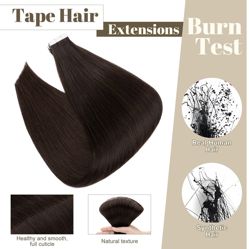 - Tape hair extensions specifications: Hair Length--14inch; Quantity & Weight--10pcs/ 20g; Colour--#2 Dark Brown (12-14inch:2g/pc,16-24inch:2.5g/pc)