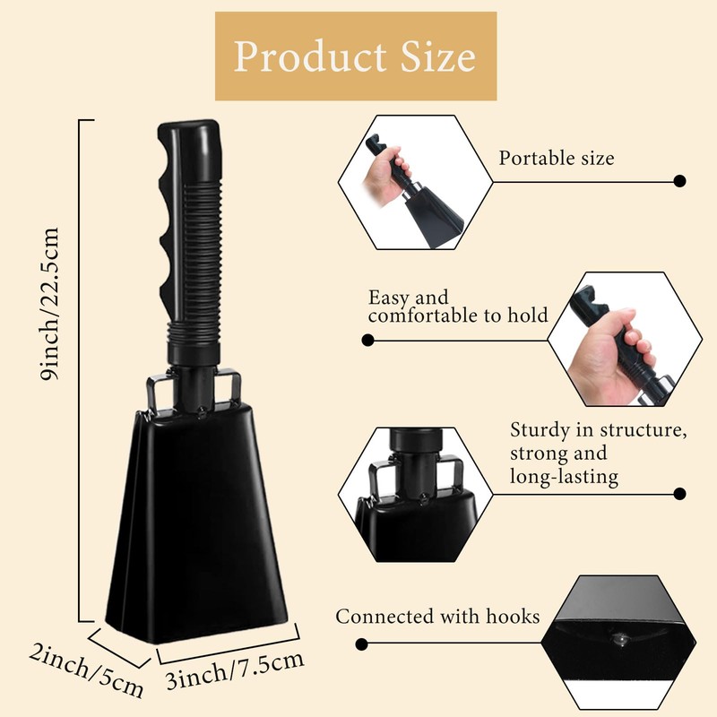 - Convenient Size: Each with-handle cowbell measures approximately 3 x 2 x 9 inches, making it compact and lightweight. Easy to carry, these cowbells are designed for portability, fitting comfortably in bags without taking up too much space