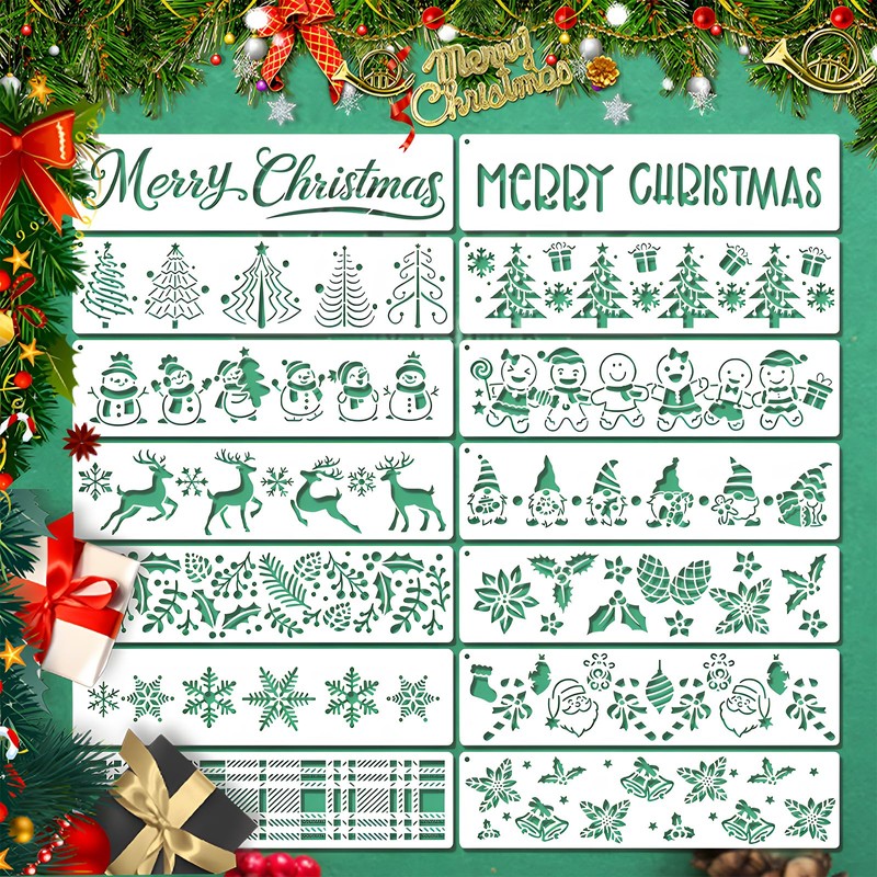 - 14 colourful stencils - Each template is coloured and features classic Christmas motifs: trees, reindeer, snowmen, elves, gifts and much more.