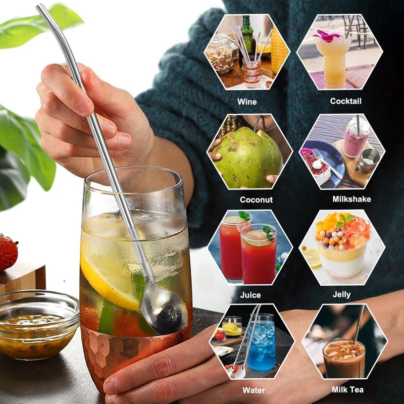 - Stainless Steel Straws Spoon can be used for stirring and drinking a variety of beverages, such as: fruit juice, milkshake, smoothie, coffee, etc.. Very suitable is bars, cafes, home.