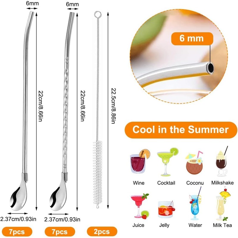 - Set Details:You will receive 7pcs smooth drinking straw spoon, 7pcs threaded metal spoon drinking straws silver and 2pcs cleaning brushes. The spoon straw size is 22cm/8.66in, outer diameter is 5mm, inner diameter is 3.5mm, the brush size is 22.5cm/8.85in. enough to meet your usage needs.