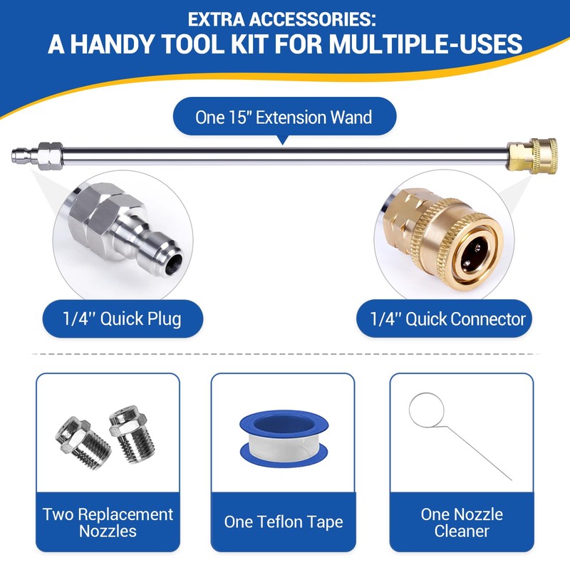 • 【For Dads/Husbands/Men/Him】Enhance your pressure washing experience with the included extra accessories. The package comes with one extension wands for added reach, a nozzle cleaner for easy maintenance and two replacement nozzles for long-term usability. We promise that MEKOH provides life-long after-sales service for each customer, please let us know if you need any help.