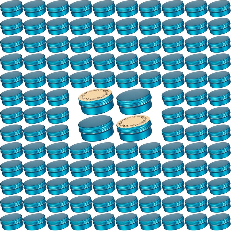 140 Pack 3oz/90ml Screw Top Aluminum Tin Jars with Screw Lids and Blank Labels - Refillable 90ml Metal Containers for Lip Balms, Candles, Salves, Spices, Crafts (Lake Blue)