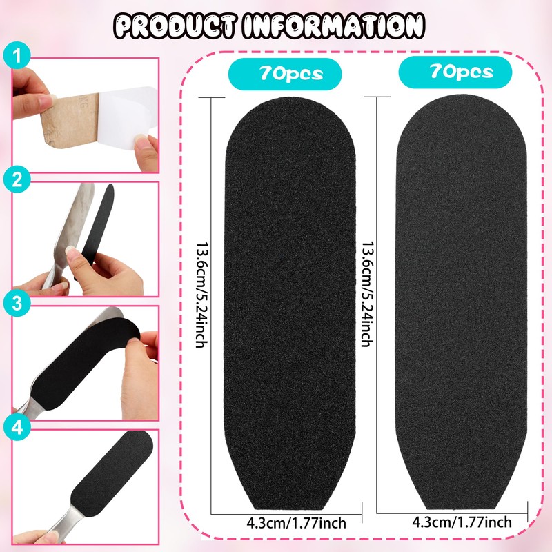 - 【Size Details】: The stainless pedicure file refills have 2 kinds of grits styles, 120 grits and 180 grits, 70 pieces for each style, and is about 13.6 x 4.3 cm/ 5.35 x 1.69 inch, ideal for satisfying your various using requirements, safe to smooth your feet skin