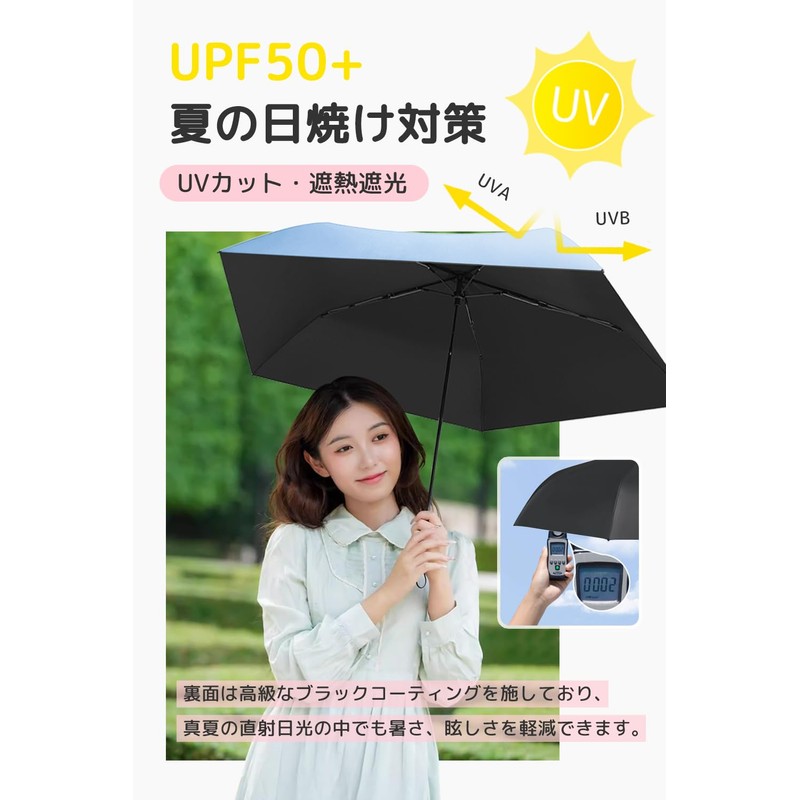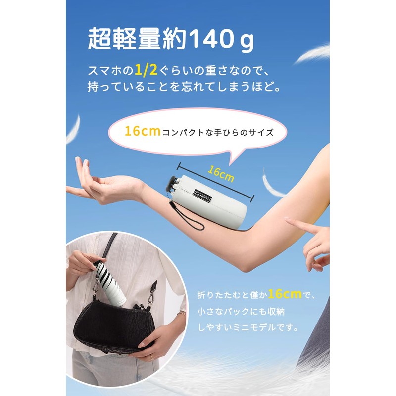 - ☂【140g超軽量&携帯便利】厳しい暑さの中で毎日持ち歩いても負担にならないように、持っていることを忘れる程の重さ140gの超軽量タイプに作られた日傘です。傘骨に丈夫で軽い炭素繊維を採用しており、軽量化を実現しました。折りたたみ傘は4cmX16cmのコンパクトサイズに折り畳むことができるので、常にカバンに入れておいても邪魔にならずスペースも取らなく、持ち運びやすいです。