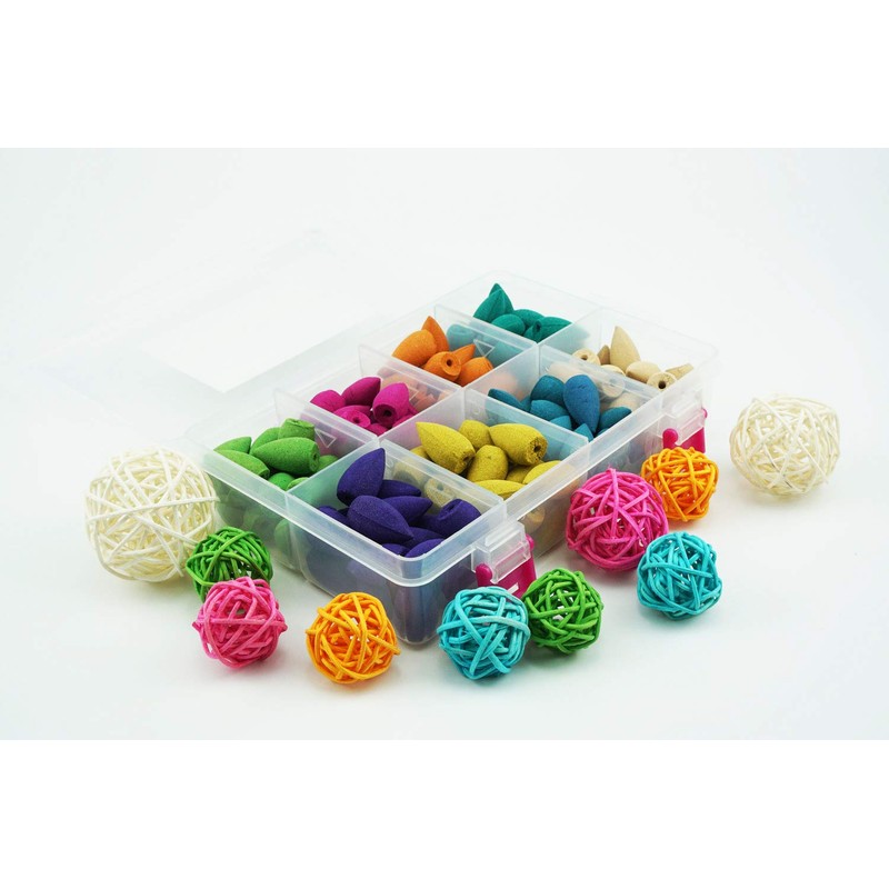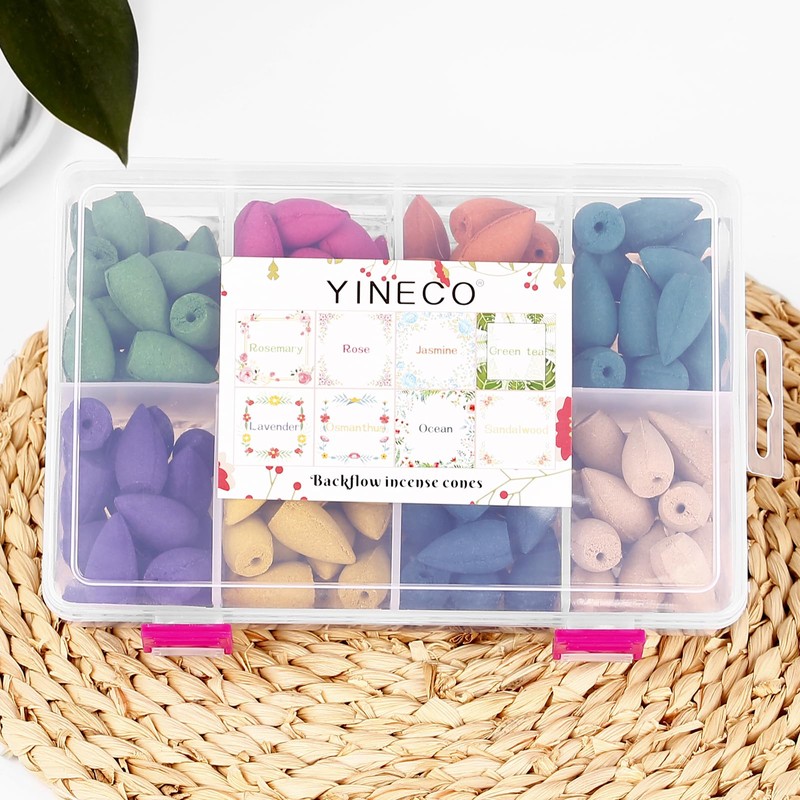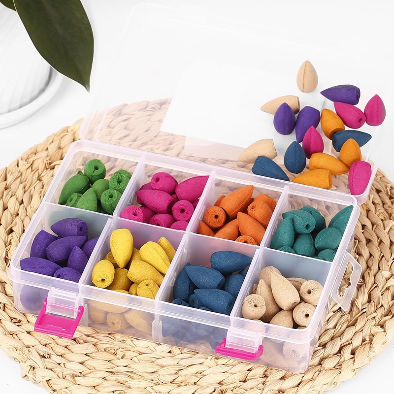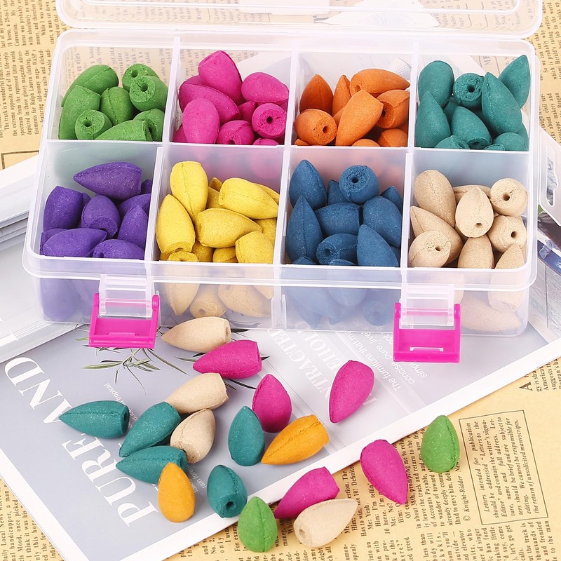 - Package:High quality food grade PP box contains 140pcs backflow incense cones, 8mixed natural scents, sufficient quantities to meet your different needs (Rosemary*17,Rose*17,Jasmine*17,GreenTea*17,Lavender*18,Osmanthus*18,Ocean*18,Sandalwood*18)