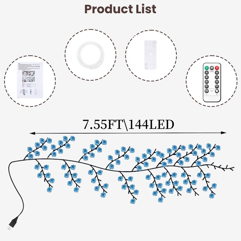 - 🌸Charming wall decoration: This LED blue cherry blossom tree light is 2.3m long and features delicate brown branches with natural and realistic textures. Soft pink cherry blossoms are carefully wrapped around the vines, paired with 144 LED light beads, emitting a soft and charming light, adding a tranquil and romantic atmosphere to any room, adding an elegant embellishment