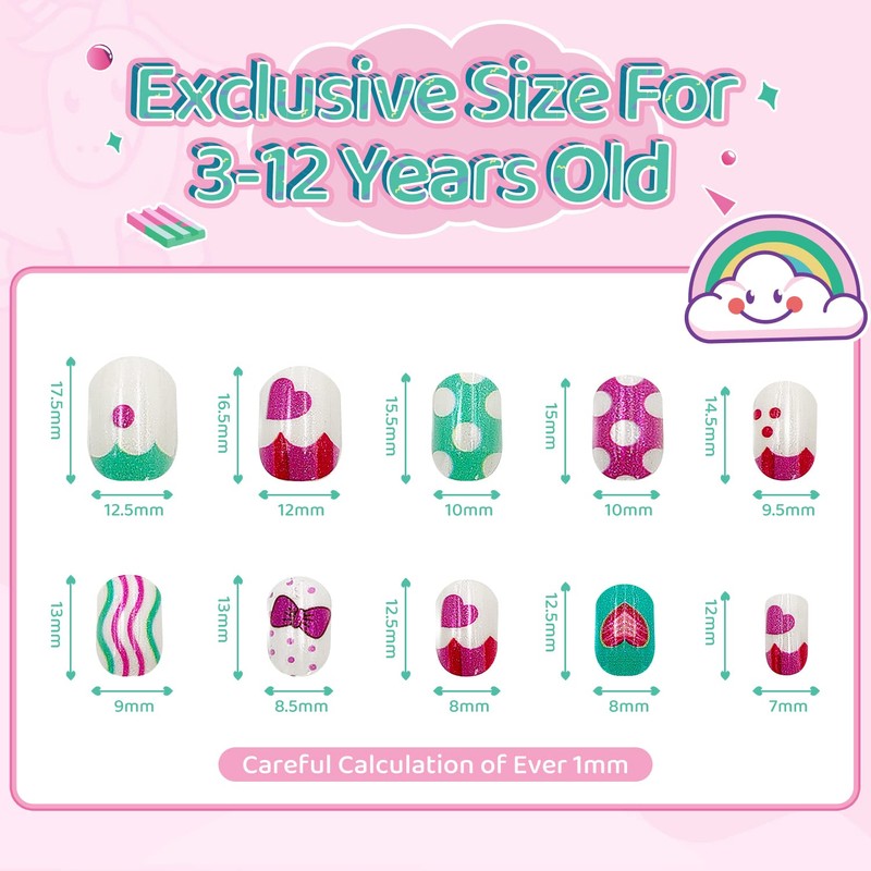 - 【Simple and Convenient Operation】Each piece of kids nails comes with adhesive backing, easy and convenient to paste and very strong, just choose the right artificial nails and stick them on your nails for about a minute to complete your cute nail art. When you are ready to try other designs, place them in warm water for 2 minutes, then gently peel them off from the side and the girls kids fake nails set will come off without damaging your original nails.
