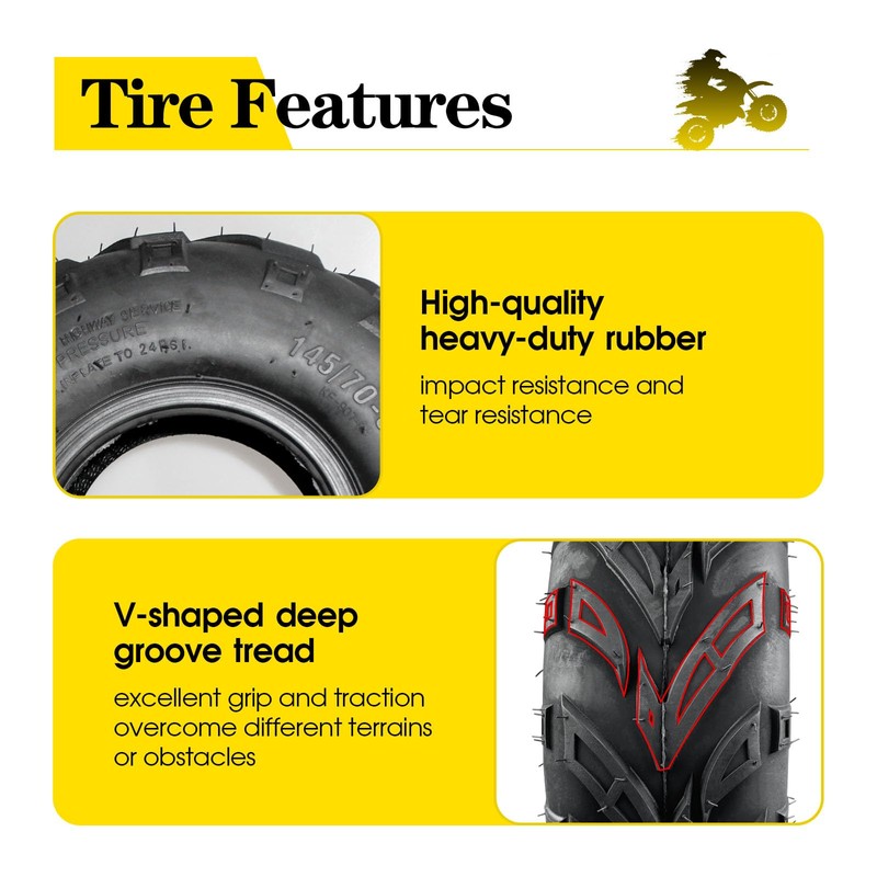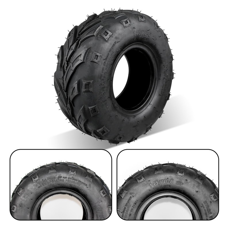 - Excellent Driving Performance: 145 70-6 tubeless tire has thickened side structure to enhance the tire's wear resistance and anti-skid properties, provides excellent shock absorption effect and powerful traction on dirt, gravel and grass etc terrain, brings excellent off-road passability.