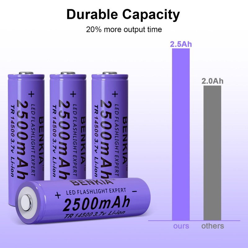- 【High Capacity】Long lasting 2500mAh 14500 battery, easy to charge. Support stable 3.7volt output voltage, makes the devices work more stable and lasting longer, ideal replacement batteries for high frequently used devices