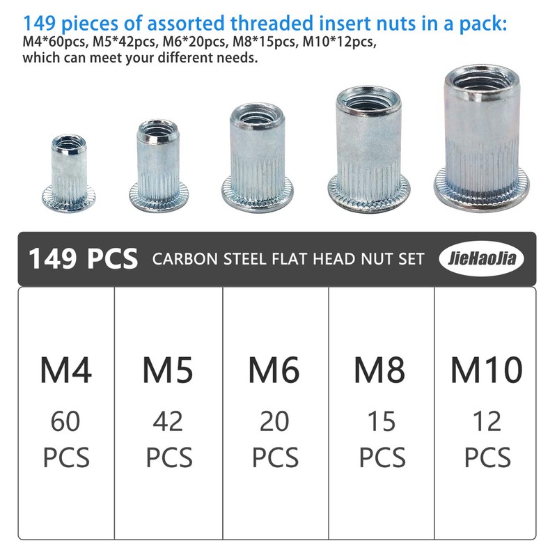 • 5,PACKAGE: We provide 149 pieces of assorted threaded insert nuts in a pack: M4*60pcs, M5*42pcs, M6*20pcs, M8*15pcs, M10*12pcs, which can meet your different needs. These rivet nuts assortment packaged in a plastic box with separate containers to convenient for take and store parts of any size, and it's portable, easy for usage, store and transport.
