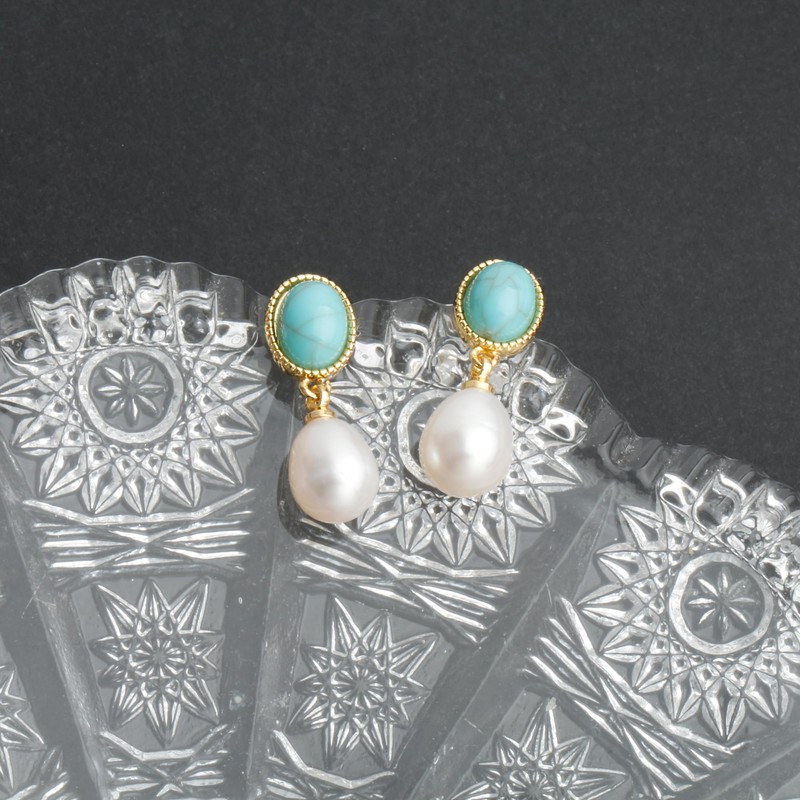 14K Gold Plated Cultured White Pearl Dangling Drop Earrings with Turquoise, Sterling Silver Posts