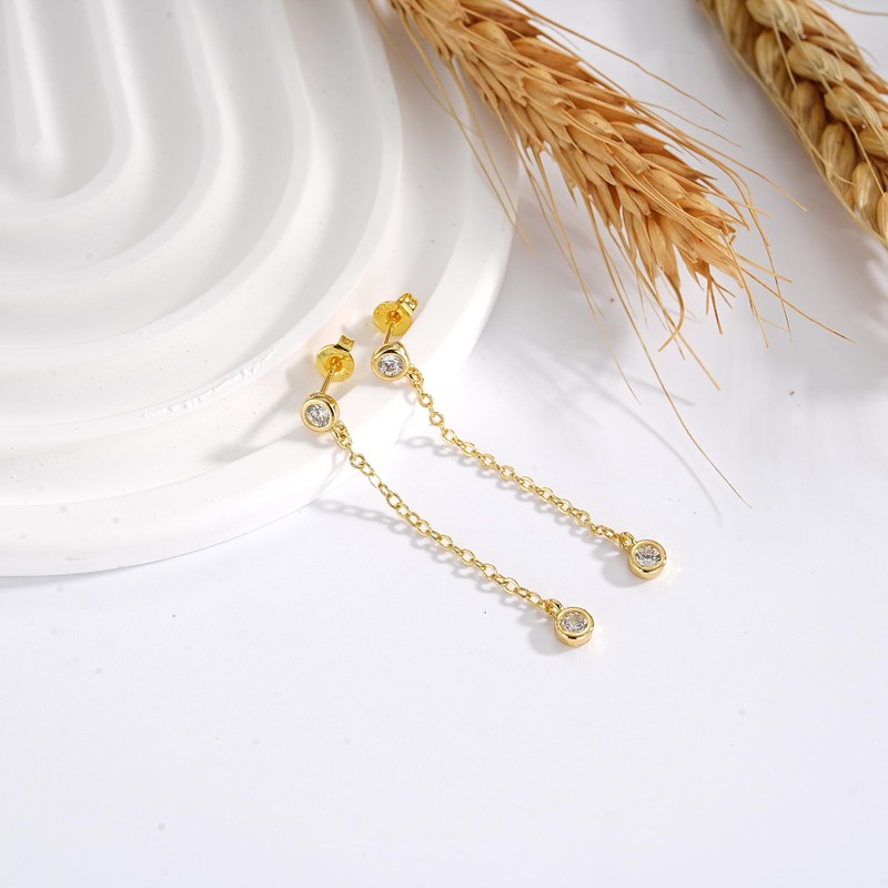 - Gold dangle earrings setted on solid 925 sterling silver post, which is hypoallergenic, nickel free and lead free, the all drop earrings are with 14k real gold plated for durablity, total lenght: 45mm, with two AAAAA+ bezel cz diamonds