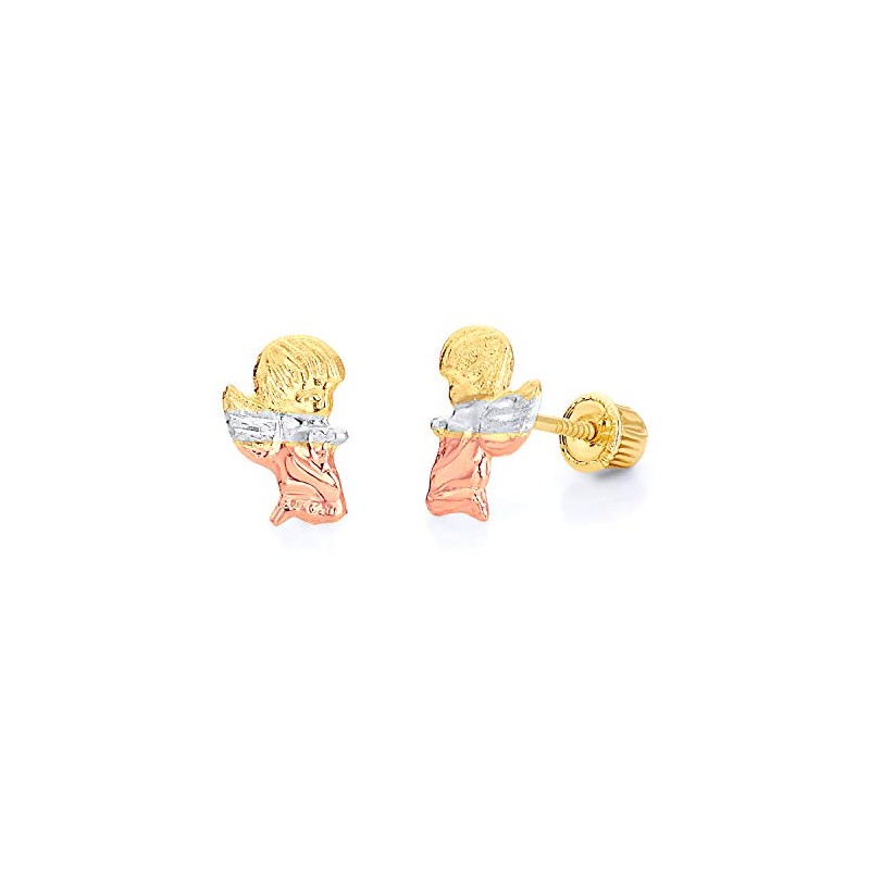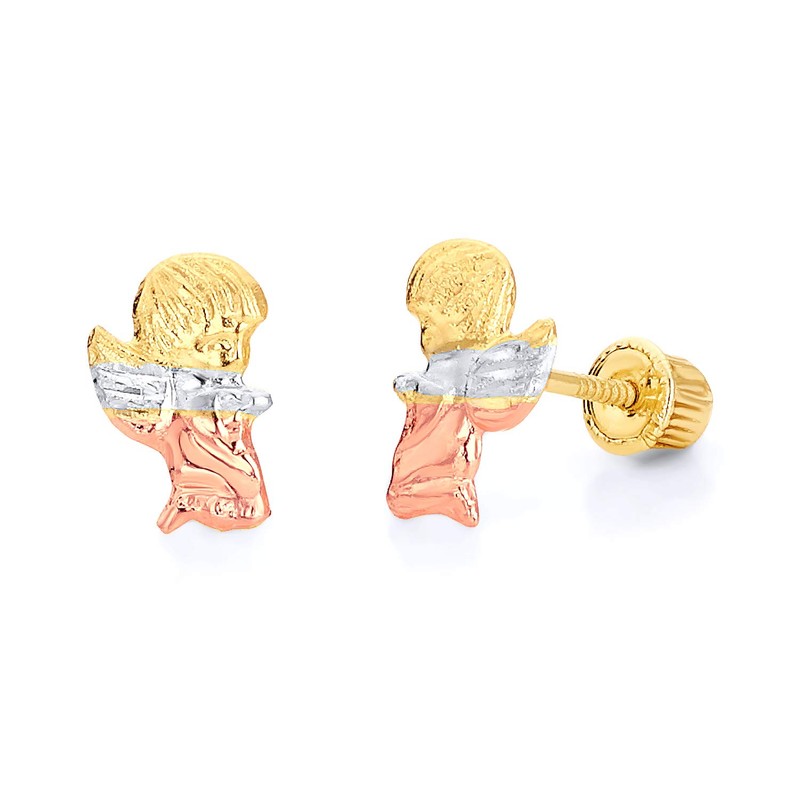 14k REAL Tri Color Gold Guardian Angel Stud Earrings with Screw Back