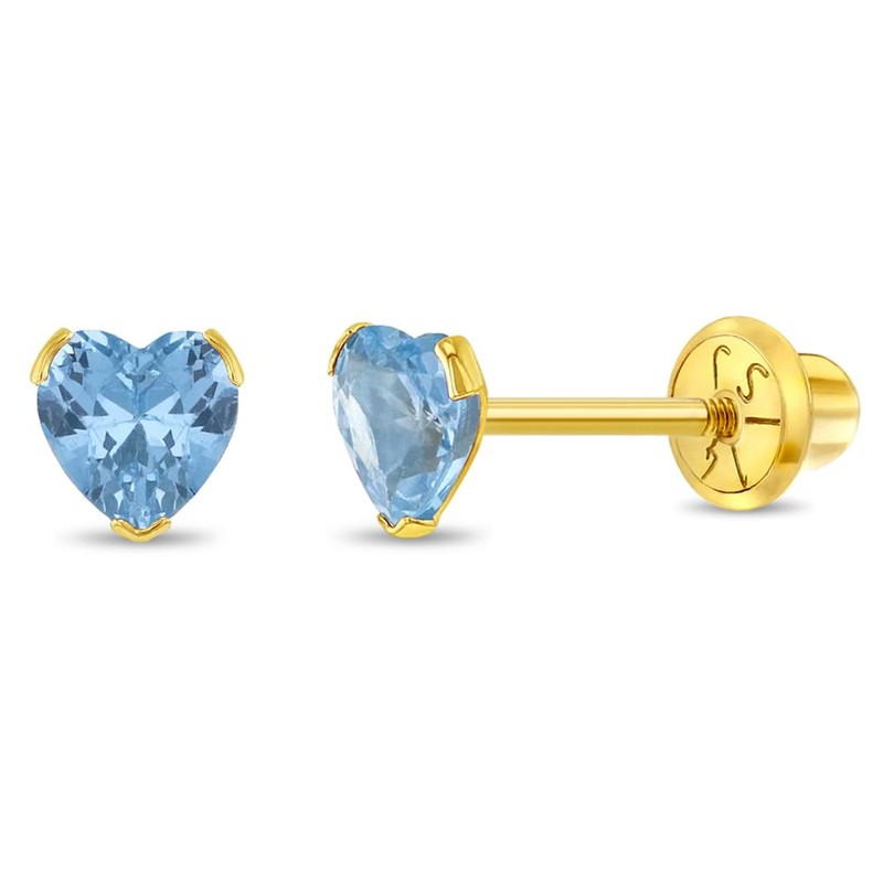 - Details: Delight the March-born little girl in your life with this pair of earrings. Our simulated squamarine earrings showcase a heart shaped aqua blue cubic zirconia stone. Meticulously crafted in 14k yellow gold, these fashionable and elegant earrings boast a secure screw back locking mechanism for enhanced comfort and safety. Designed for girls aged 1 to 9 with small and sensitive ears, these earrings come in a presented gift box.