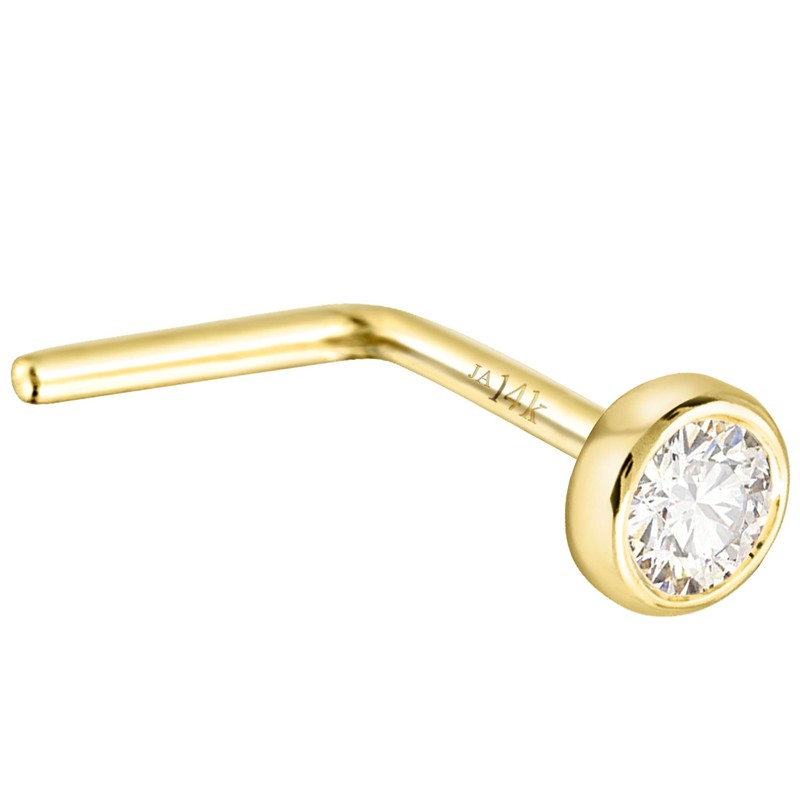 Choice of ONE PIECE 14Kt Yellow Gold or White Gold 22G L-Shape Bend Stud Nose Ring with Round Brilliant Cut Diamond in Bezel Setting. April Birthstone Nose Ring.