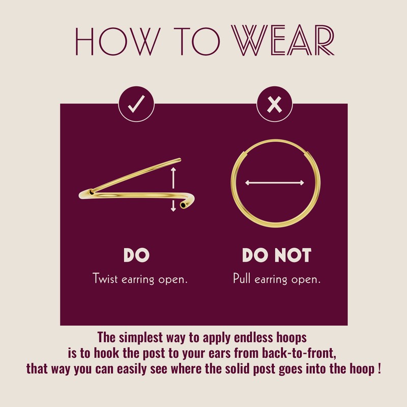 - The simplest way to apply endless hoops is to hook the post to your ears from back-to-front, that way you can easily see where the solid post goes into the hoop.