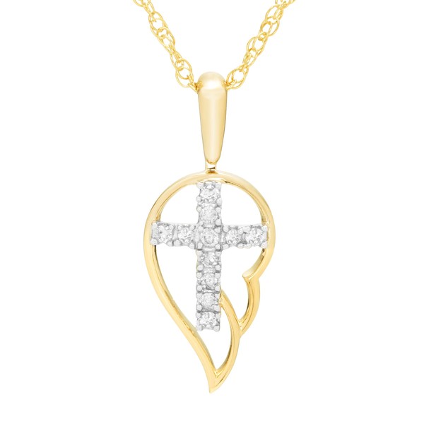 - Embrace divine elegance with the 14K Yellow Gold Plated Sterling Silver 0.10cttw Angel Wing Cross Diamond Necklace Pendant. Its intricate design features a diamond accent cross suspended within graceful angel wings, symbolizing heavenly protection and remembrance. This memorial pendant, complete with an 18" chain, is a perfect gift for religious occasions, offering solace and inspiration for everyday wear, a cherished emblem of faith and eternal love.