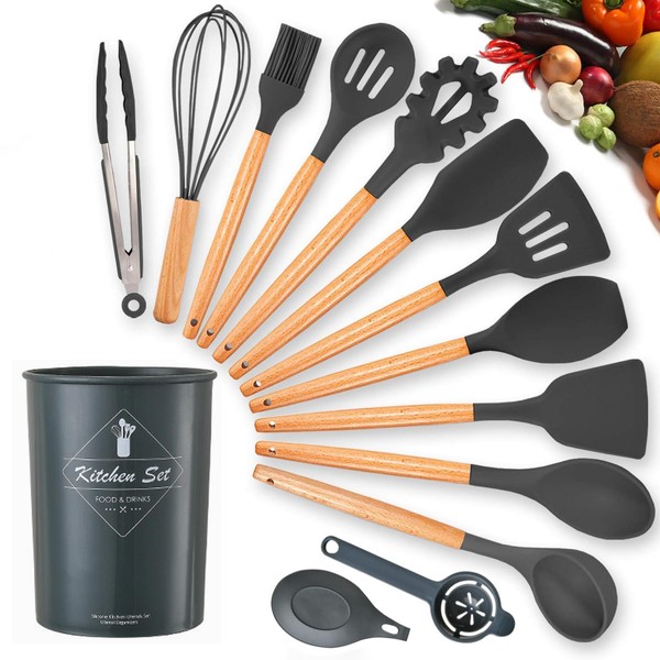 14PCS Juego de Utensilios de Cocina de Silicona, Utensilios de Cocina, Antiadherentes, Resistentes al Calor, aptos para Cocinar y Hornear, con Espátula/Cuchara/Batidor/Cuchara Medidora(Negro)