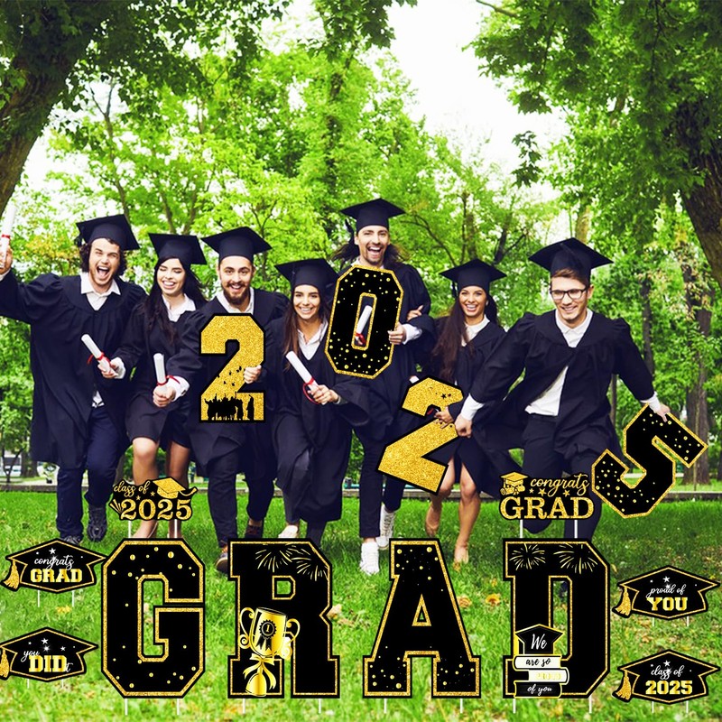 - 14Pcs Value-Packed Set: This set includes 14 graduation yard signs and 28 sturdy plastic ground stakes. Featuring the letters "GRAD" and "2025," along with four bachelor's cap-shaped signs, these yard decorations embody the iconic elements of graduation, letting you express your pride effortlessly.