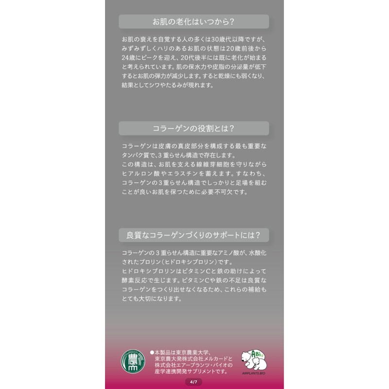 - コラーゲン代謝研究から、代謝の改善に着目し、産学連携(東京農業大学)で開発しました。