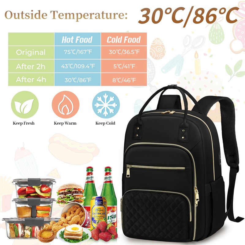 -1.The lunch backpack for women is made of durable materials and applied quilting techniques to create exquisite, delicate textures and a fashionable style. The gold dual thicken zippers operate smoothly and add an elegant touch to the lunch backpack.