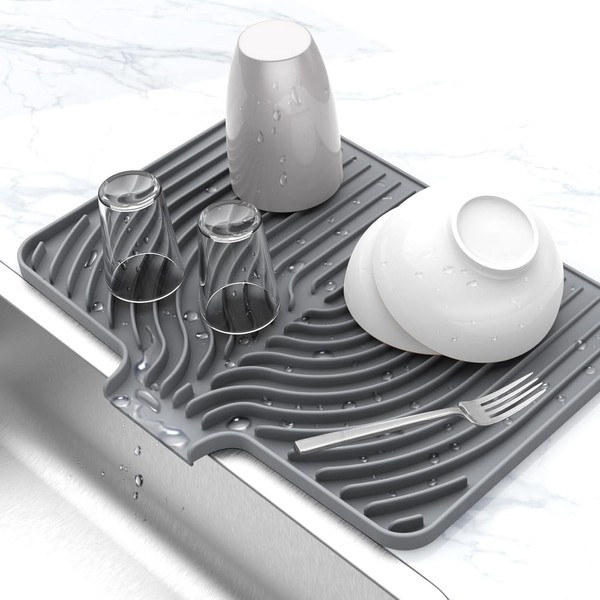 15.8x13InchNon-Slip Drain Pad with Built-in Drain Silicone Dish Drying Mat for Kitchen Counter, Easy Clean Pad for Countertop Protection (Grey, L)
