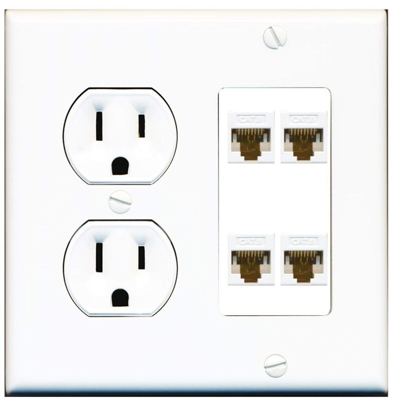 15 Amp Duplex Round Power Outlet 4 Port Cat6 Ethernet Wall Plate White