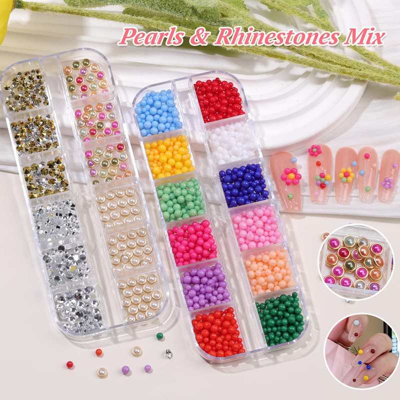 1 box (12-grid) flatback & pointed rhinestones with metal-ring-surrounded half-pearls