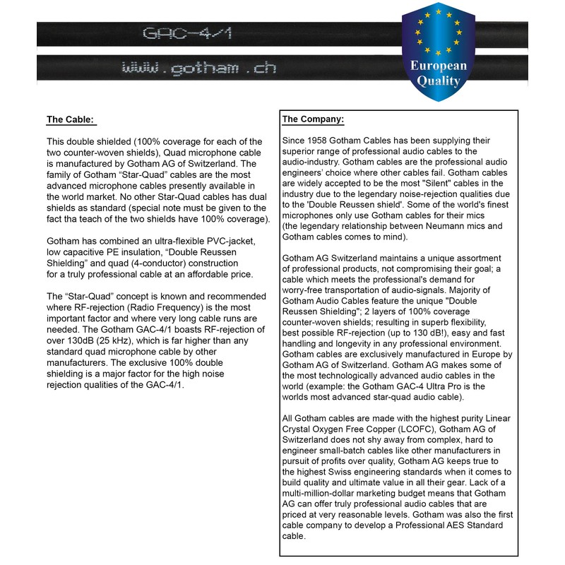 - Gotham GAC-4/1, Star-Quad LCOF Copper cable sports extensive shielding (2x100% coverage LCOF Copper shields) , by far the best shielded quad cable in the market . Boasts RF-rejection of over 130dB (25 kHz), & ideal for even very long cable runs.