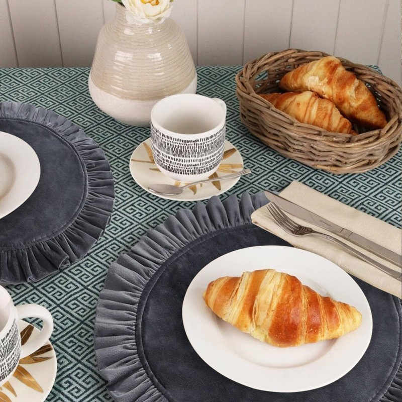 15 Inch Velvet Round Placemat with Ruffle for Dining Table Outdoor Placemats Non-Slip Washable for Gathering, Occasional Decoration and Family Parties Celebrations Set of 4, Gray