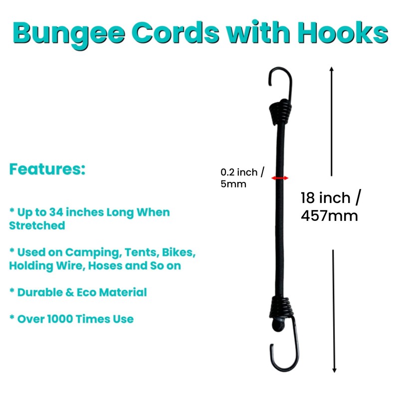 - Mini Bungees Cord with Hooks for Your Needs: Each package includes 15 pcs black tarp ties downs bungee cord with 2 hooks, up to 34 inches long when stretched. Cord diameter measures at 0.2 inches