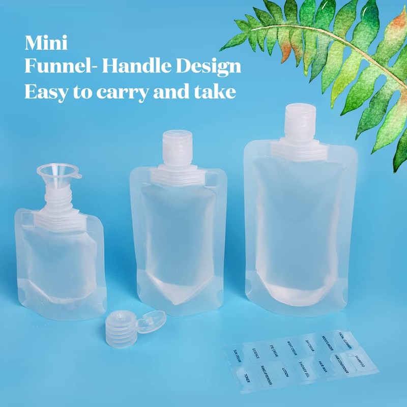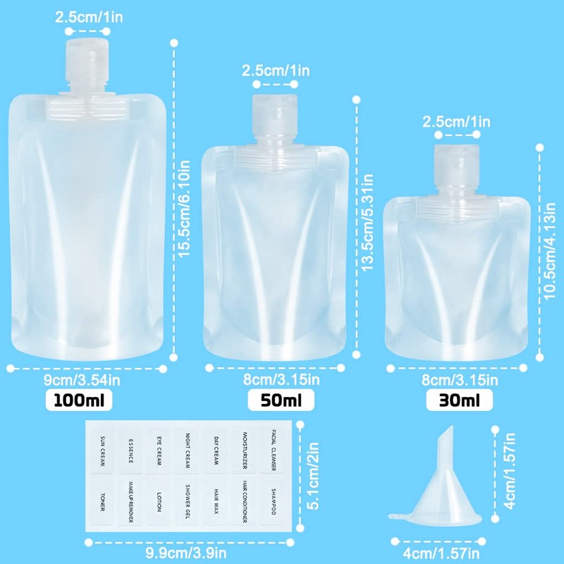 - AFFORDABLE SET:Each package includes 15 pcs travel fluid makeup packing bags, 1 transparent funnel and 2 label stickers. There are 3 different sizes pouches for your choice: 30 ml, 50 ml, 100 ml, 5 pcs each size. Enough for use and replacement, and meet your daily and travel needs.