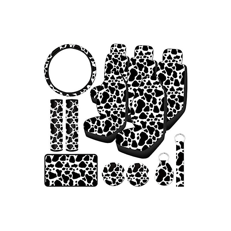- Comprehensive interior car accessories:the cow print car accessories set includes 1 piece of steering wheel cover,5 sets of seat covers,2 pieces of car coasters,2 pieces of seat belt pads,1 piece of wrist strap,1 piece of cow print keychain and 1 piece of armrest pad cover,which are abundant enough to satisfy your using demands in daily life