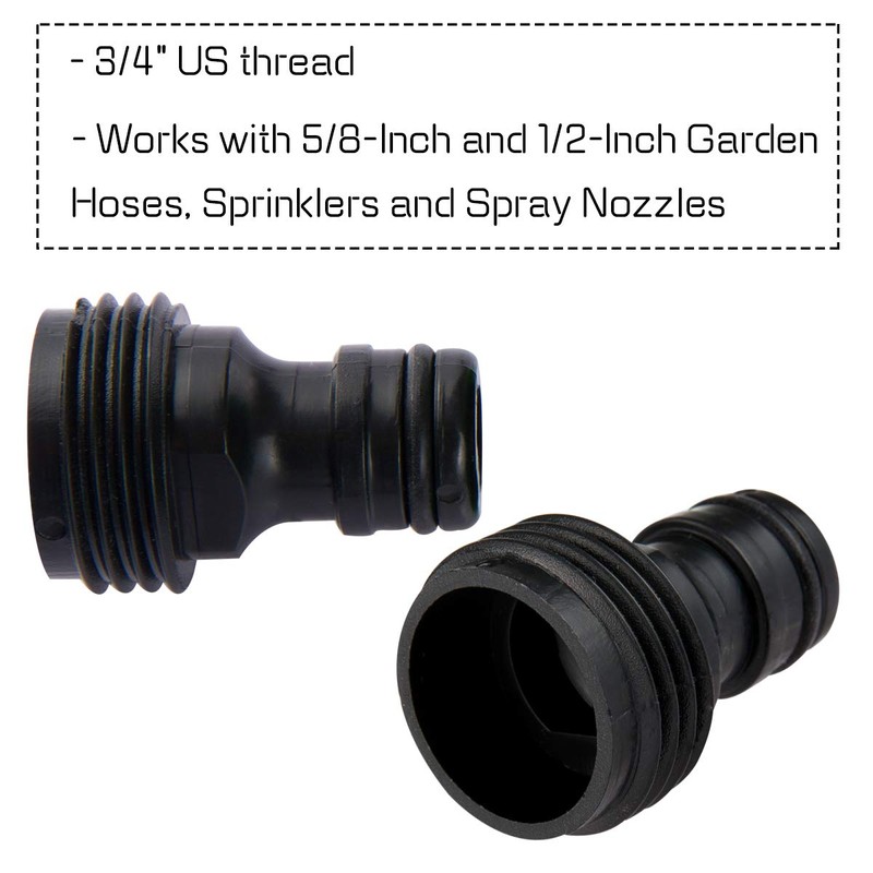 - Wide application: Those 3/4" US thread connectors are suitable for 5/8-Inch and 1/2-Inch garden hoses, sprinklers and spray nozzles. It is widely used in garden irrigation, flower watering, crop irrigation, car washing, etc