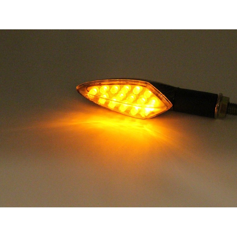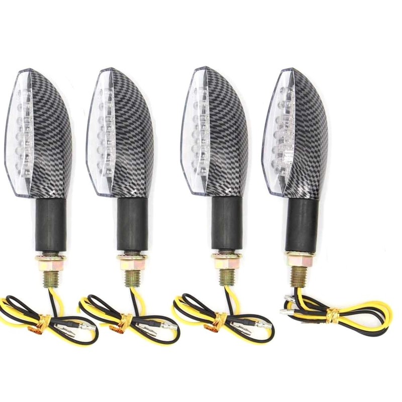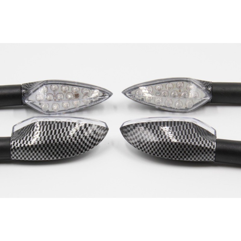 - Carbon pattern plastic body with clear lens LED turn signals 15 LEDs are placed in the arrow shaped body. Change the look of your bike or dress it up!