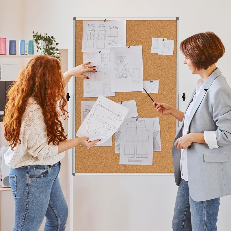 - Standing Double-Sided Board Combo - Compared to wall-mounted boards, this double-sided boards combination offers a compact footprint of just 4.2 sq/ft, while providing a generous 15.5 sq/ft of total available space. One side features a whiteboard for writing, and the other a cork board for pinning, offering versatile functionality