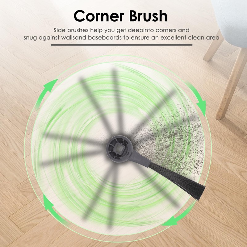 | Material Type: | Accessory set: 15 pieces included: 1 roller brush, 3 HEPA filters, 1 pre-filter, 2 foam filters, 6 side brushes, 2 mop pads |