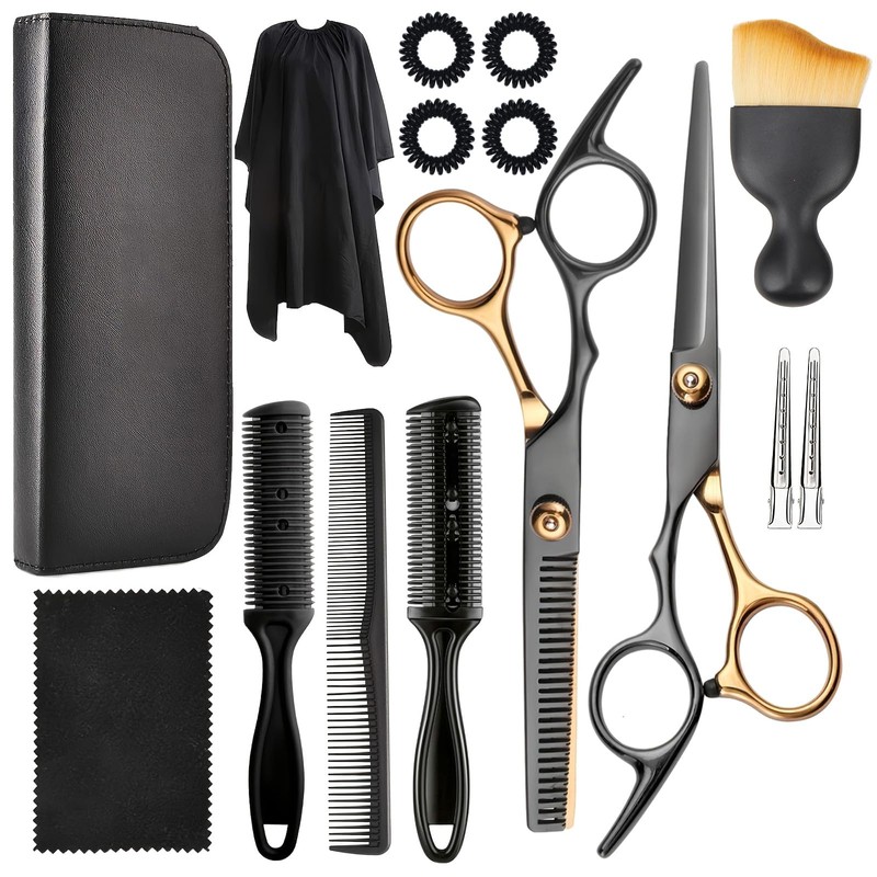 - 【Familien Friseurschere Set】 Dieses friseurschere set beinhaltet 15 praktische produkte: 1 haarschere, 1 effilierschere, 1 friseurumhang, 1 haarbürste, 2 frisierkämme, 2 klammern, 1 stylingspinsel, 4 haarbänder, 1 ledertasche und 1 reinigungstuch. Die hochwertige aufbewahrungstasche aus leder ist staub- und wasserdicht und ermöglicht eine übersichtliche ordnung aller friseur zubehör teile. Das mitgelieferte reinigungstuch erleichtert die pflege der werkzeuge nach der verwendung.
