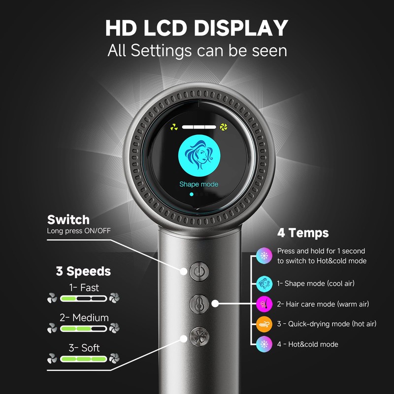 - 4 Temps & 3 Speeds: Professional hair dryer has 4 air temperature adjustment modes, Shape mode (cool air), Hair care mode (warm air), Quick-drying mode (hot air) and Hot&cold mode (press and hold for 1 second, Activate alternating hot and cold cycles). 3 speeds (soft/medium/fast). At the same time, it is equipped with a HD LCD display, makes it easy to adjust the settings to suit your hair type, creating a more convenient and comfortable way to care for your hair