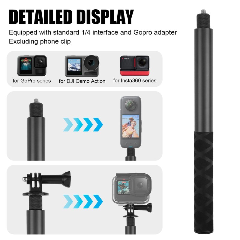 - Versatile camera compatibility: the selfie stick monopod is compatible with various cameras, including Insta360 X4, X3, ONE X2, ONE R, GoPro Hero series, DJI action cameras and more. It has a 1/4 screw mount and allows seamless use with various action cameras through adapter accessories. It is an excellent tool for content creators.