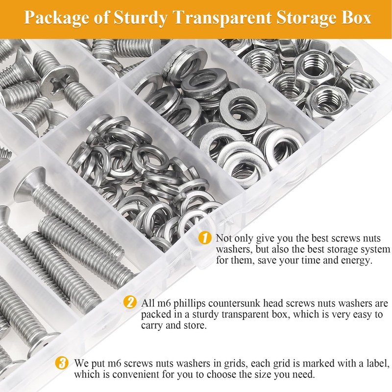 - √ Package Included: 150 pieces Sutemribor M6 x 8 /10 /12 /16 /20 /25 /30mm phillips countersunk head machine screws nuts washers are packaged in a clear plastic box, we put screws nuts washers in 10 grids, each size is marked with a clear label, which is very convenient for you to carry and use. If you have any questions, please free to contact with us and we will reply to you as soon as possible.