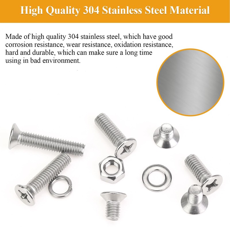 - √ Material: Sutemribor M6 phillips countersunk head machine screws nuts washers kit are made of high quality 304 stainless steel, which have smooth surface, high strength, not easy to deform, corrosion resistance and rust resistance in bad environments, which can ensure a long time using.