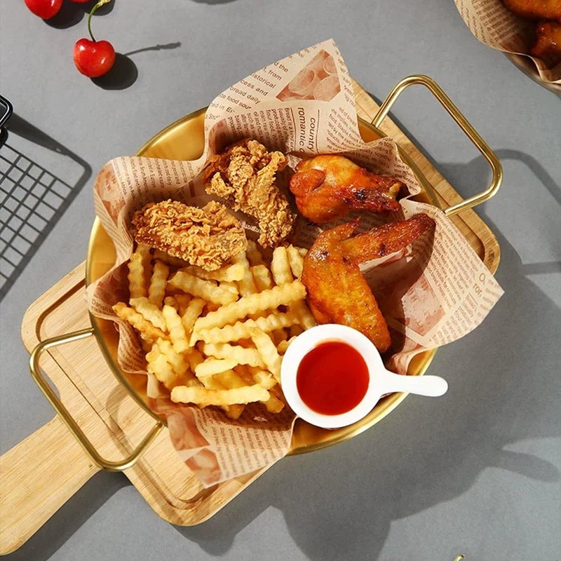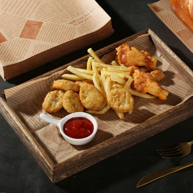 - FOOD DECORATION The burger paper baking paper is designed in a classic old newspaper printing style, classically elegant and the perfect accent for your table. Exquisite patterns can also look decorative, fashionable and elegant pattern design, which increases people's appetite