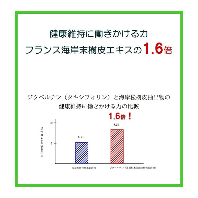 • 【タキシフォリンの「健康維持に働きかける力」はトップクラス!】ジクベルチンに含まれるタキシフォリンは、生命力の強いシベリアカラマツ特有の「ポリフェノール」です。タキシフォリン+ビタミンCで、健康維持に働きかける力がさらにアップします。